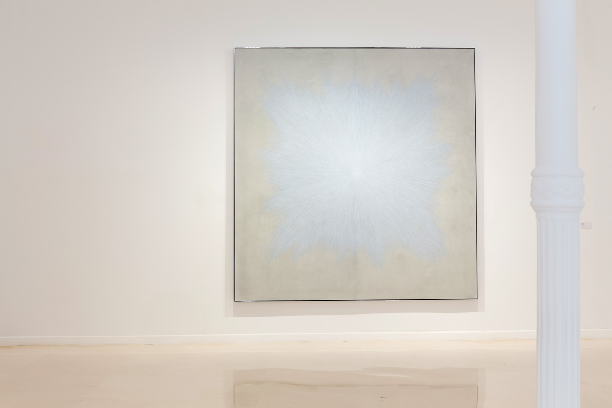 Rachel Howard's(Easington, United Kingdom, 1969)approach to contemporary painting is based on oil and canvas. Her works feature colour fields of different sizes that are unexpectedly crossed by lines and often patterns. From up close, Howard's surfaces reveal a three-dimensional - almost architectonic - quality that results from her experiments with oil and other materials, experiments that invite her to cover the whole canvas. The artist is known for how she uses gravity as an invisible brush, creating lines that seem to hide a deep formal behaviour.